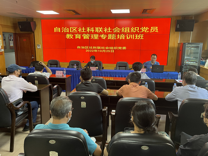 2022年10月25日上午,自治区社科联社会组织党员教育管理专题培训班和“平安广西”建设主题活动在南宁举办,自治区社科联学会部主任刘海江同志主持。中共广西酒店管理学会支部委员会组织党员参与活动。