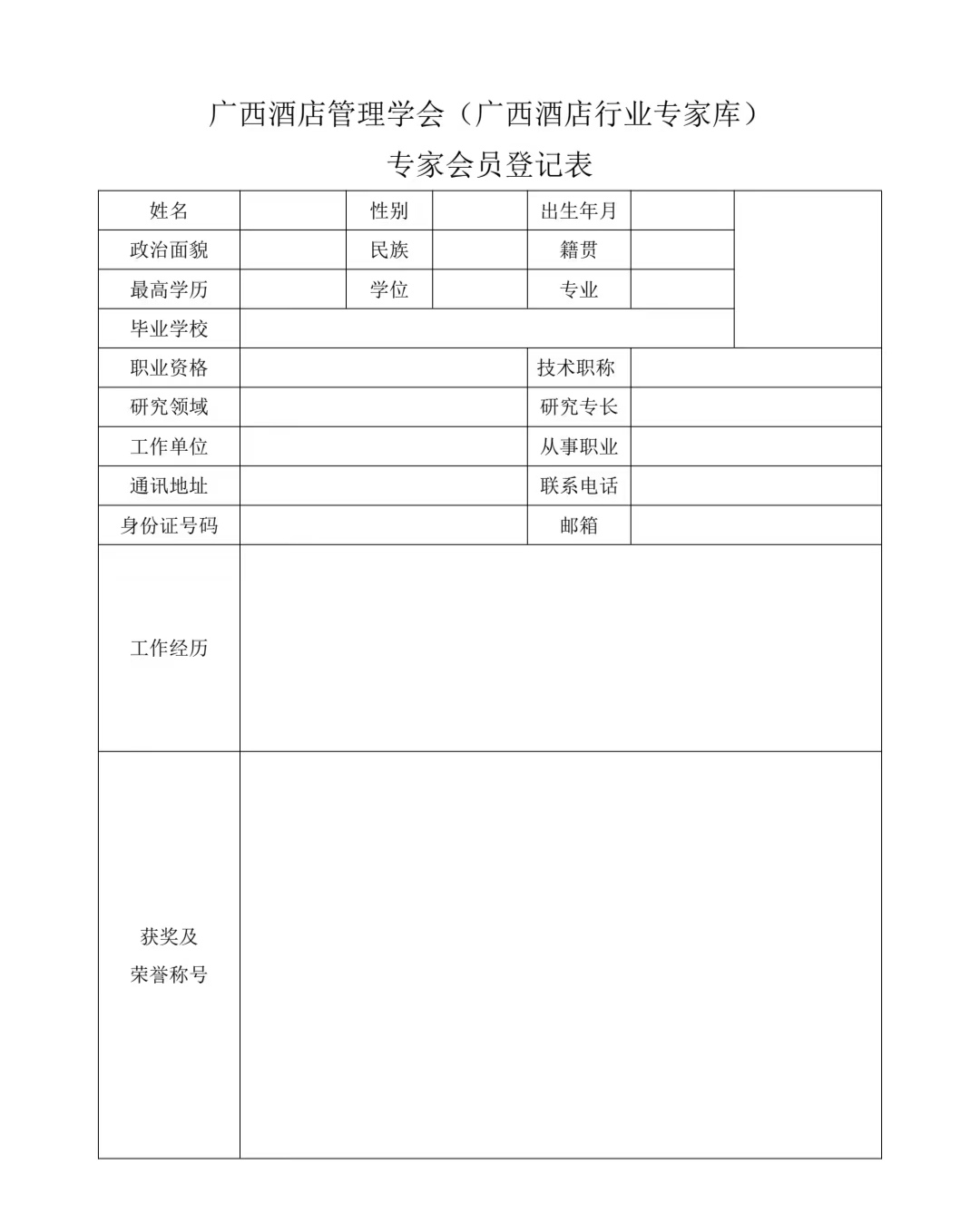 广西酒店管理学会(广西酒店行业专家库)专家会员登记表