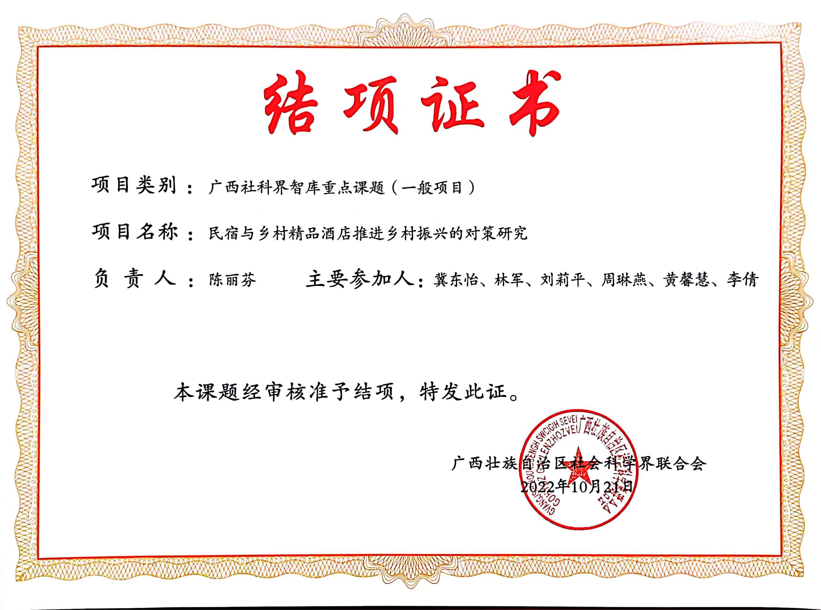 《民宿与乡村精品酒店推进乡村振兴的对策研究》课题结项证书