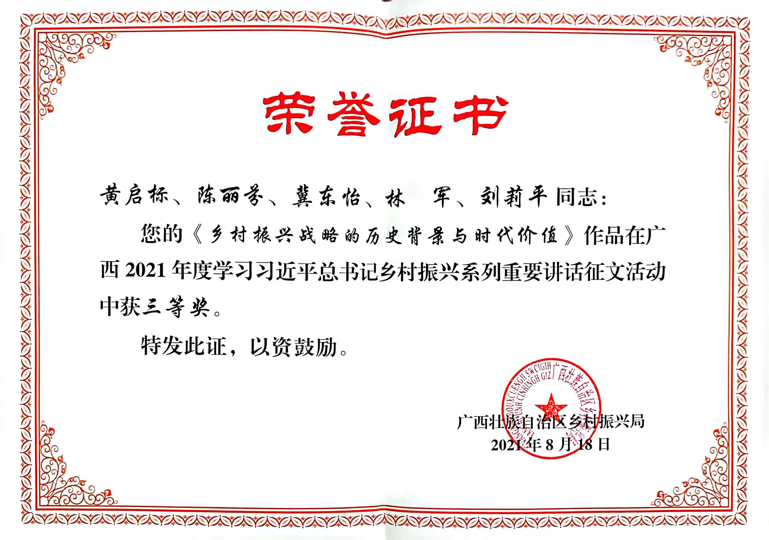《乡村振兴战略的历史背景与时代价值》荣获2021年度学习习近平总书记乡村振兴系列重要讲话征文活动三等奖