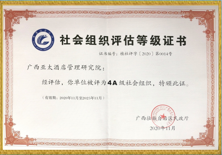 广西亚太酒店管理研究院获自治区民政厅评为4A级社会组织证书