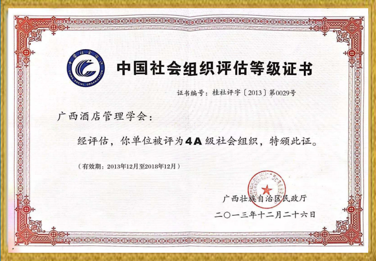 广西酒店管理学会获自治区民政厅评为4A级社会组织证书