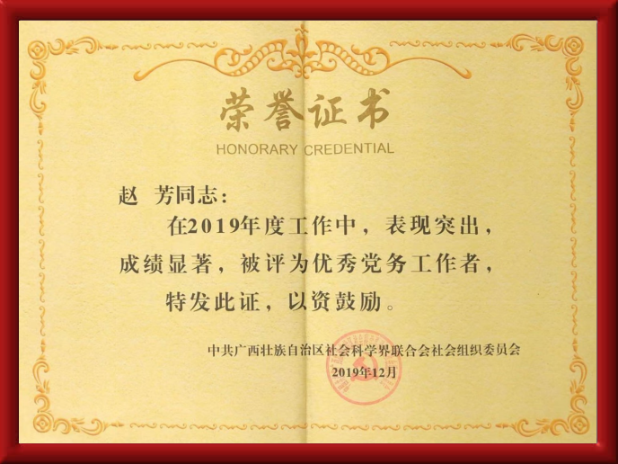 学会党支部书记赵芳同志获自治区社科联社会组织优秀党务工作者荣誉称号