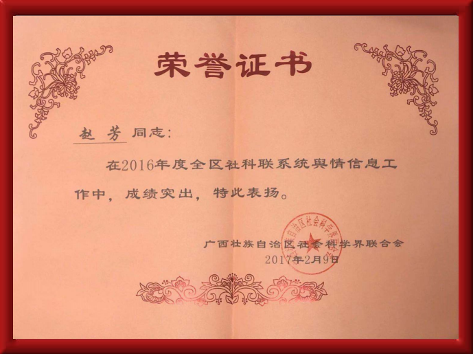 学会党支部书记赵芳同志获2016年度全区社科联系统舆情信息工作成绩突出奖