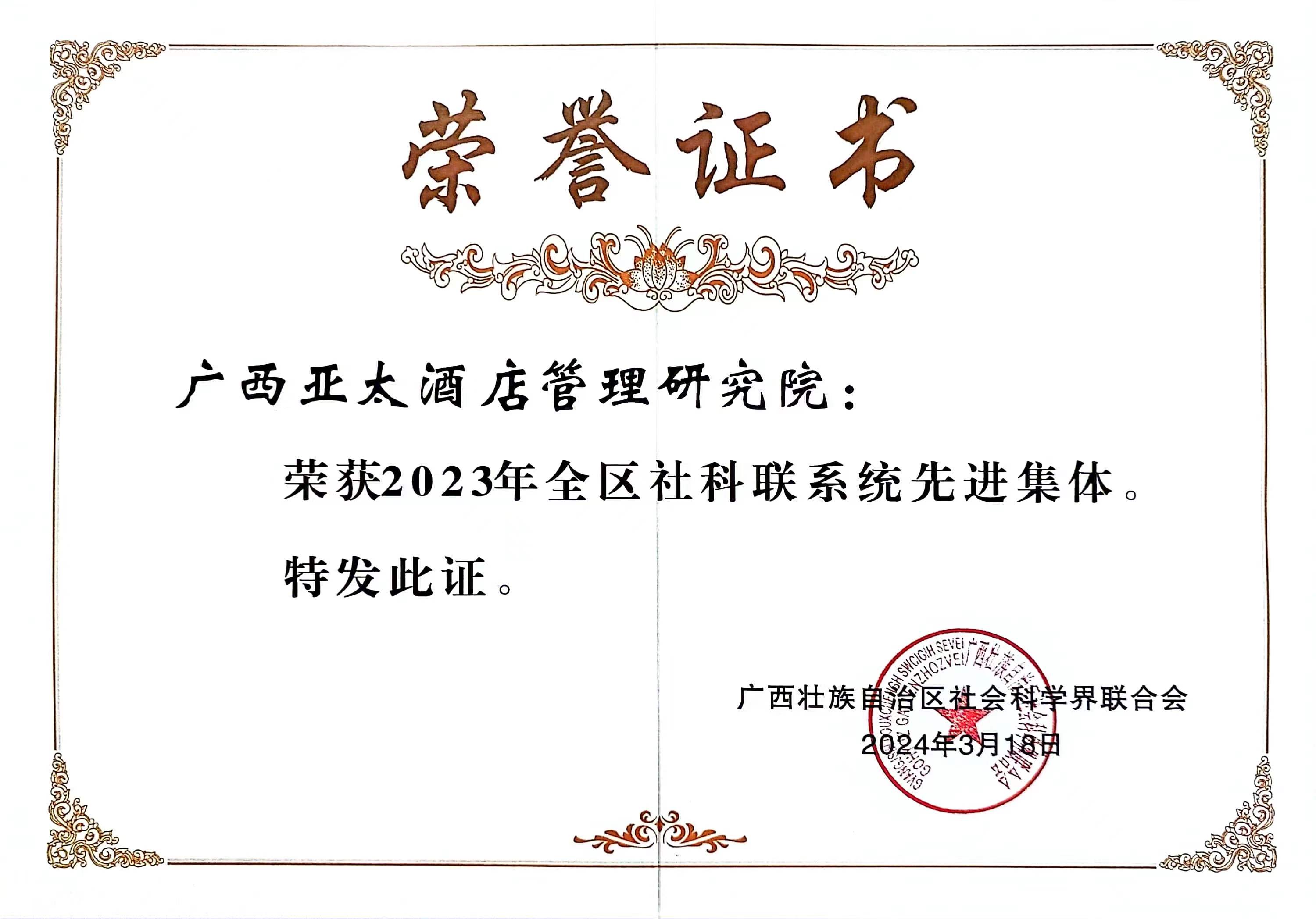广西亚太酒店管理研究院荣获2023年全区社科联系统先进集体