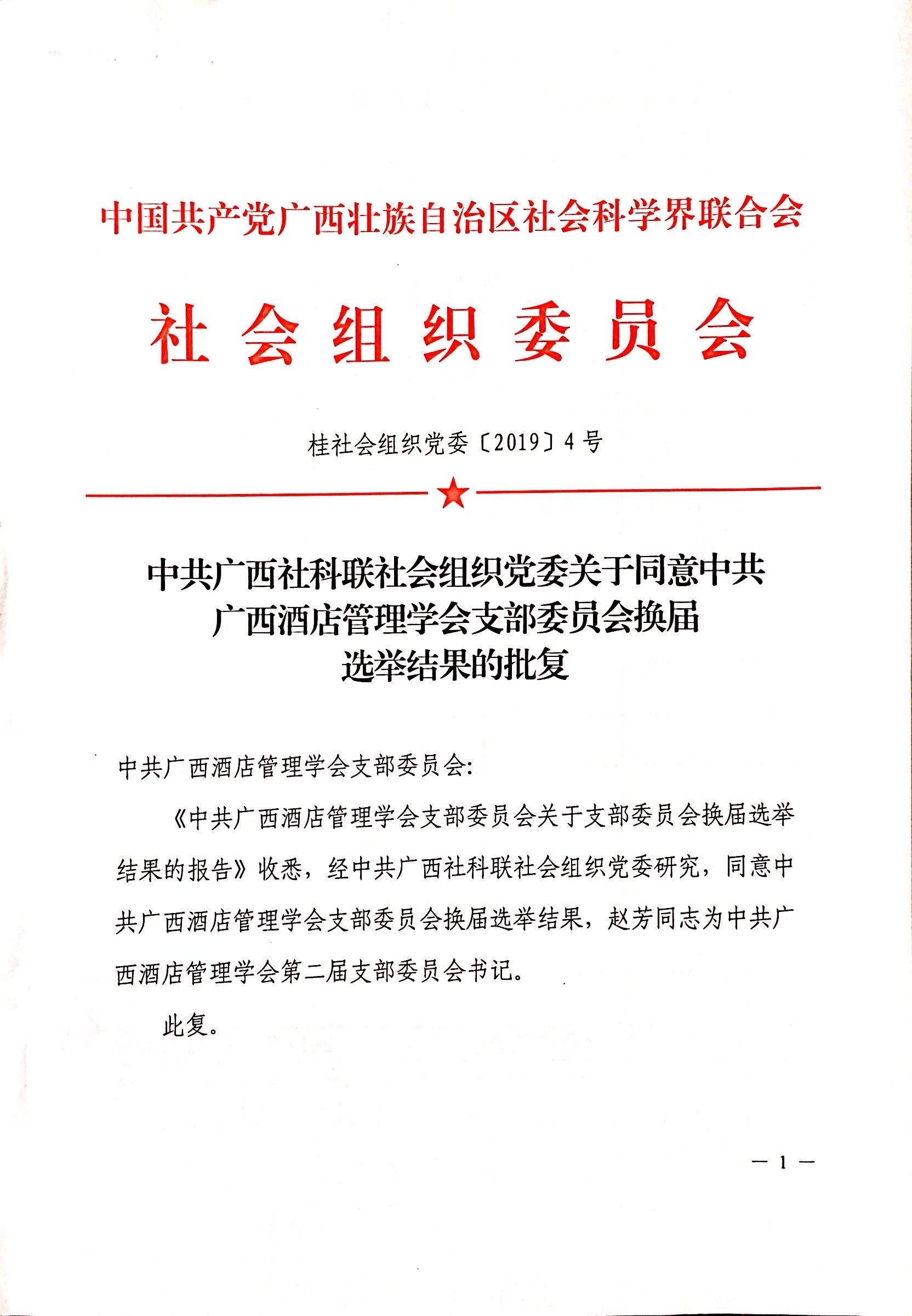 中共广西社科联社会组织党委关于同意中共广西酒店管理学会支部委员会换届选举结果的批复【2019】4号
