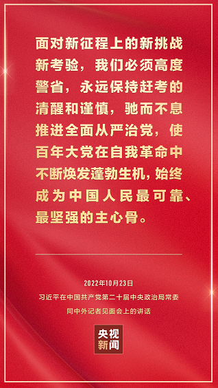 在中国共产党第二十届中央委员会第一次全体会议上当选的中共中央总书记习近平和中共中央政治局常委李强、赵乐际、王沪宁、蔡奇、丁薛祥、李希,23日中午在人民大会堂同采访中共二十大的中外记者见面。习近平发表重要讲话。