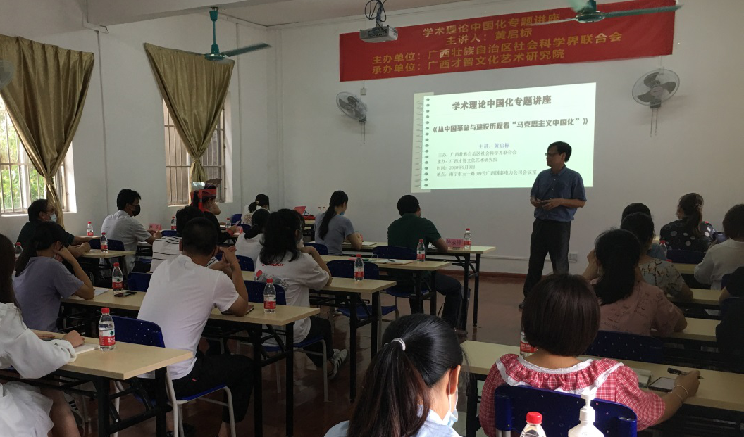 2020年9月9日上午,由自治区社科联主办,广西才智文化艺术研究院承办的学术理论中国化专题讲座在广西国泰怡养健康产业发展有限公司举行。该公司领导及员工40余人参与听讲。