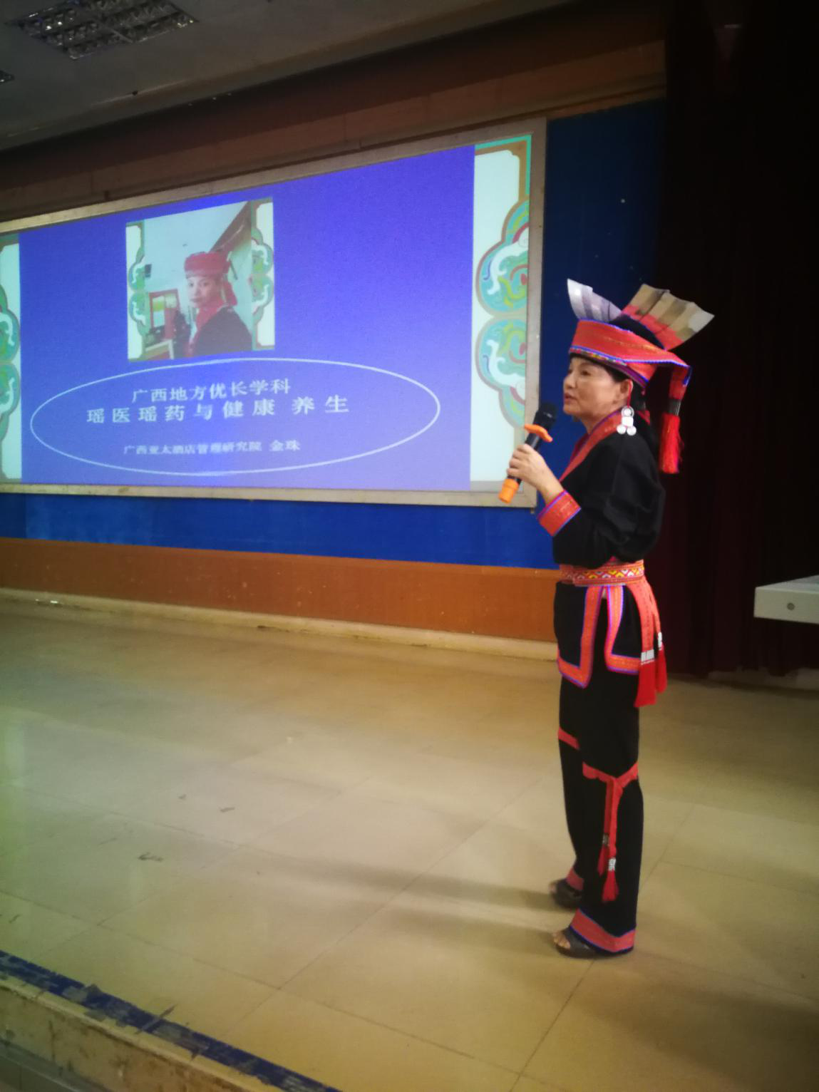 在课堂上,金珠老师向师生们介绍广西最大的药物基因库,也是中国第二大植物基因库——金秀大瑶山,描述富有神秘色彩的瑶医瑶药养生知识,尤其讲到瑶族祖先代代传内不传外的养生秘方——瑶浴时,师生们兴趣浓厚、反应热烈,纷纷渴望前去体验。