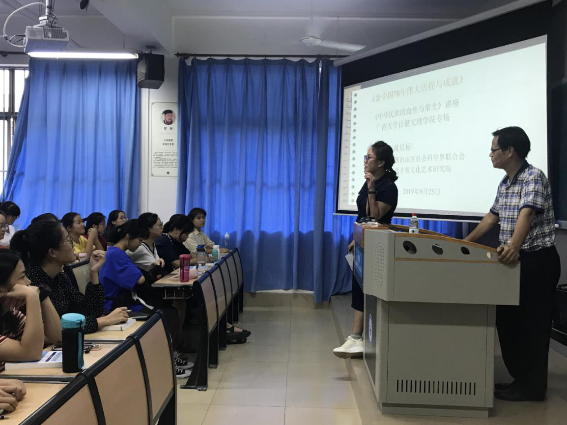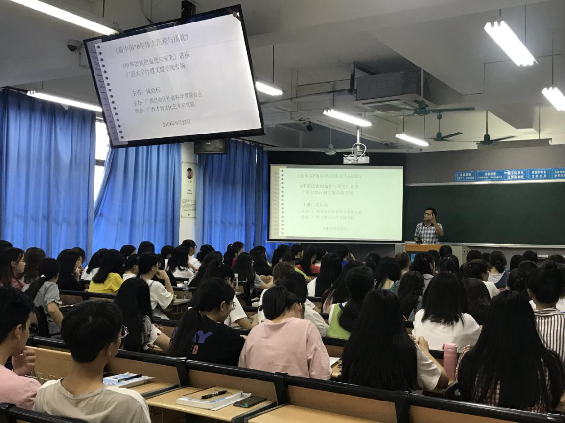 本次讲座是广西自治区社会科学界联合会发起的《新中国成立70周年伟大历程和成就》系列讲座之一,由广西才智文化艺术研究院承办,主讲黄教授是研究院特聘专家。