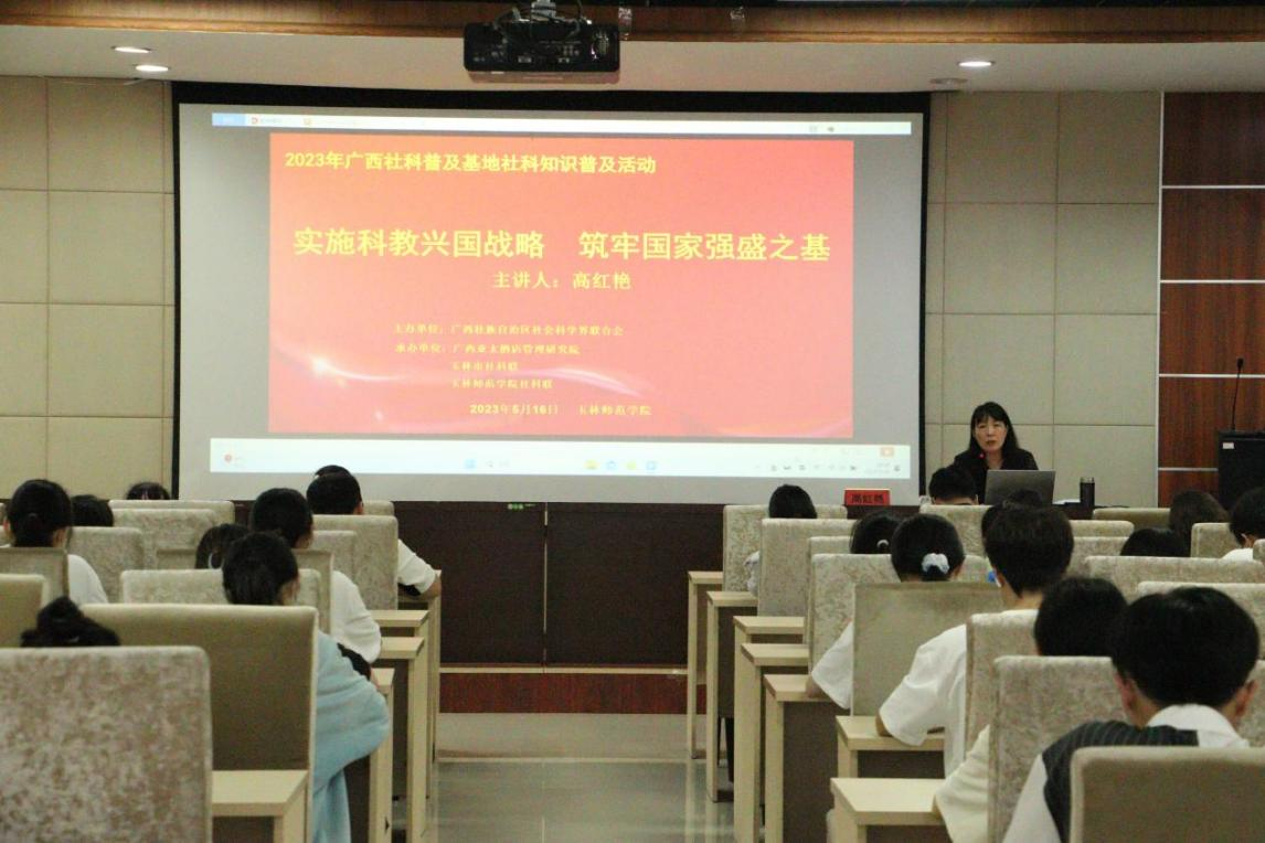 讲座邀请玉林师范学院党委常委、副校长高红艳教授主讲。讲座以“实施科教兴国战略,筑牢国家强盛之基”为主题,高红艳首先明确了科教兴国战略在新时代的科学内涵和使命任务,从办好人民满意的教育、完善科技创新体系、加快实施创新驱动发展战略和深入实施人才强国战略等四个方面进行讲授和分享,突出强调了科教兴国在新征程上的战略地位,用通俗易懂的语言、生动详实的案例向师生们介绍科教兴国战略的内涵和深远意义,及广大学子在新时代如何响应科教兴国战略,在推进中国式现代化建设新征程上付诸实践。